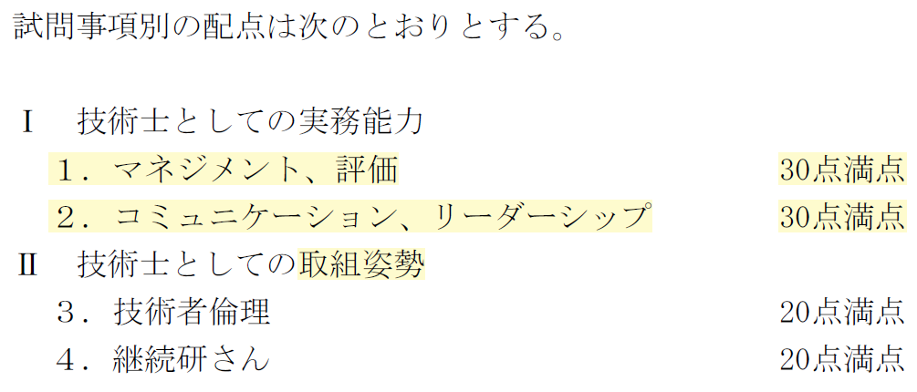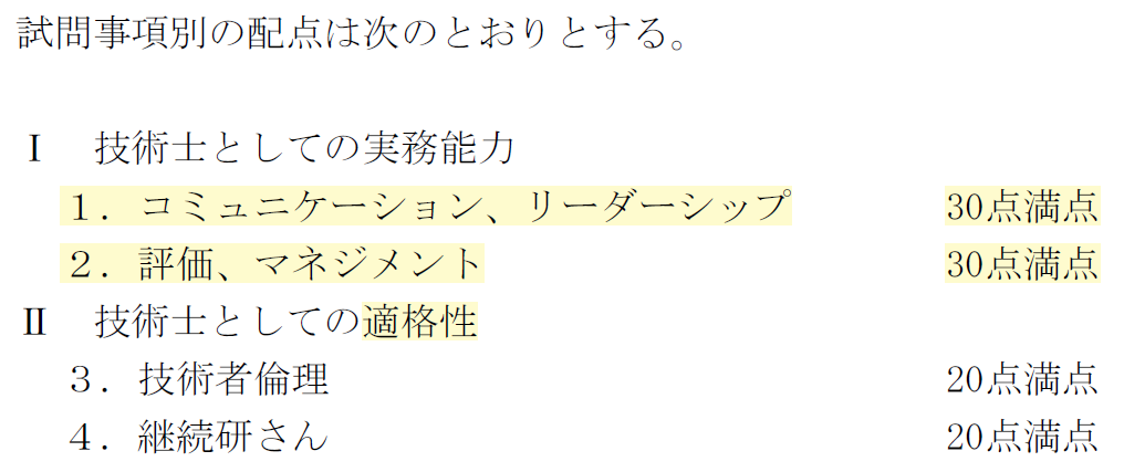 ・試問事項別の配点:技術士としての実務能力の記載順序(配点は変わらず)