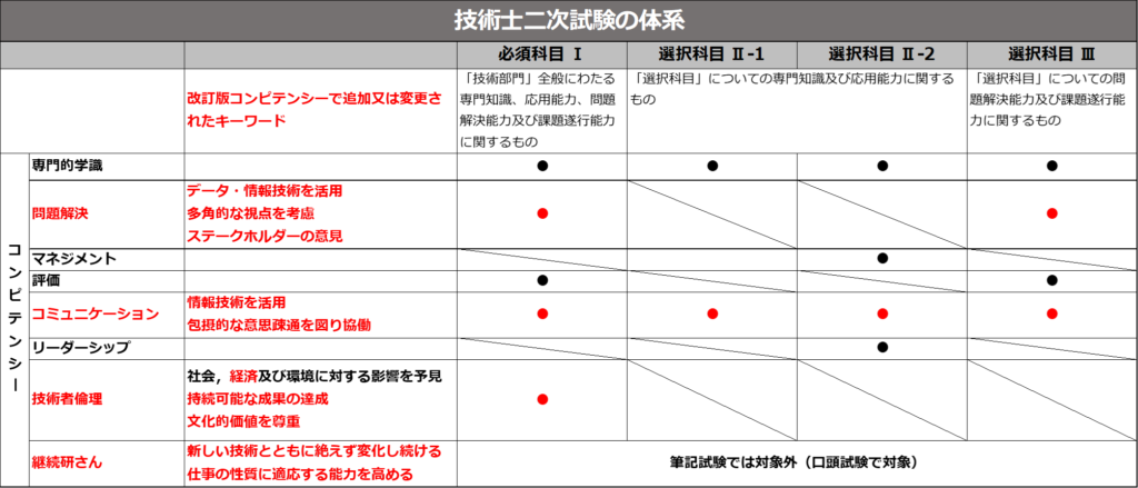 技術士筆記試験の各科目とコンピテンシーの関係は下表のとおりで、改訂版コンピテンシーに関するところを赤色で示してみました。