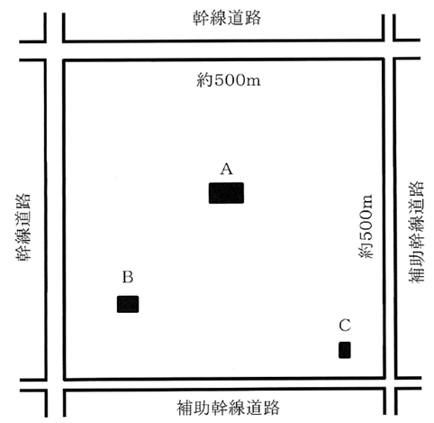 人口減少・少子高齢化が進むとともに、財政制約が高まりつつある大都市近郊の住宅市街地において、下図のとおり幹線道路及び補助幹線道路に囲まれた約500m四方の区域に存在する3つの街区公園(A:約1500㎡、B約700㎡、C:約300㎡)について、その配置及び機能の再編に関する方針を策定することとなった。