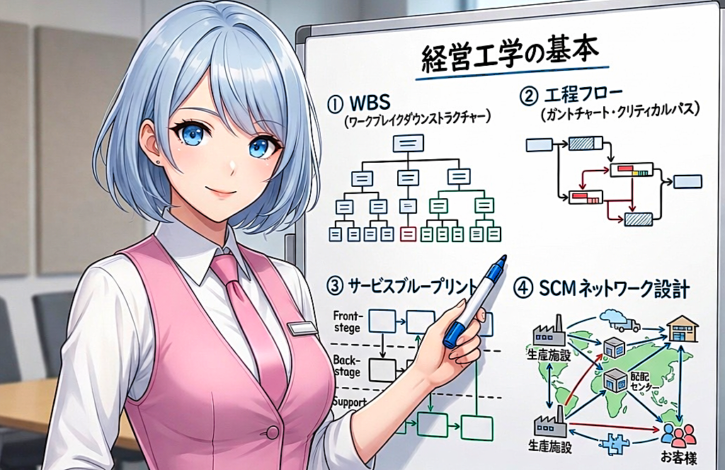 この世界を“専門用語”で可視化すると、 複雑に見えた経営工学の体系が、 計画 → オペレーション → 品質 → 組織・人材 → DX・データ活用 という一本のストーリーとして立ち上がる。